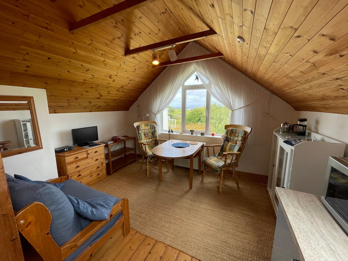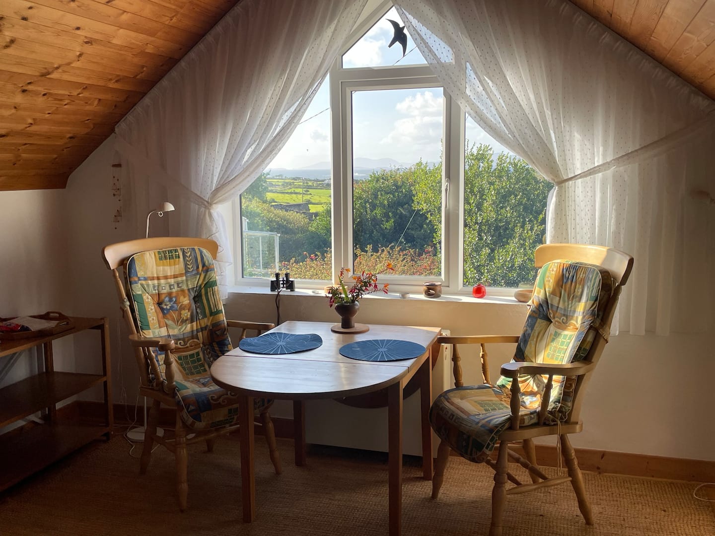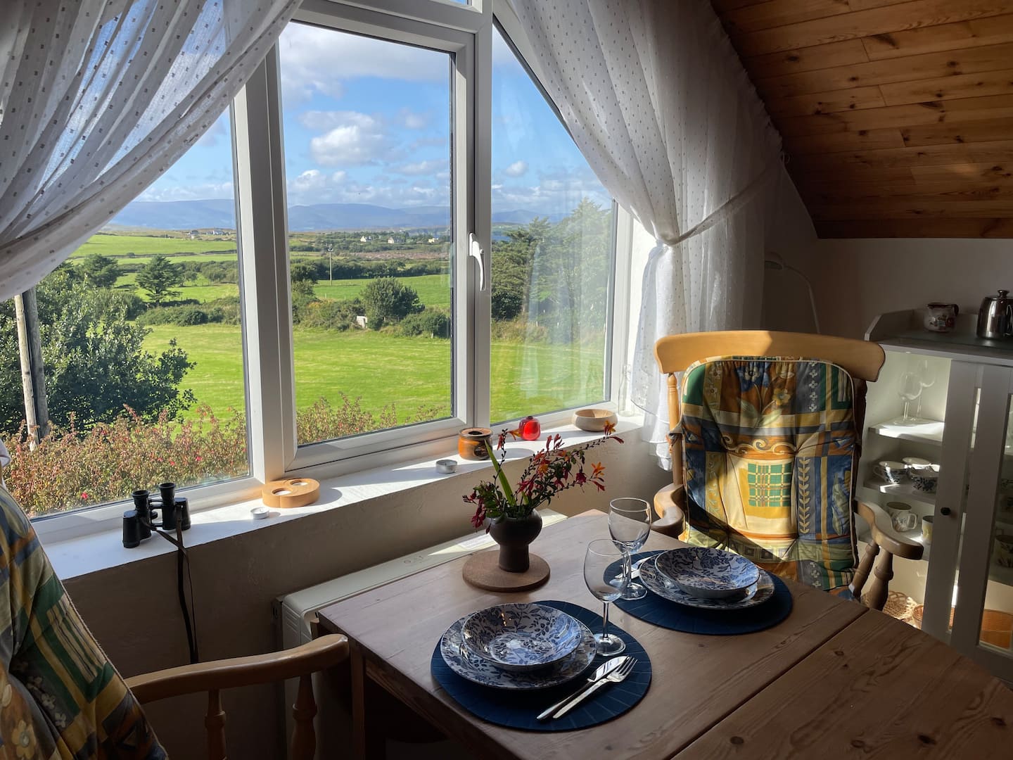 Der Südwesten von Irland ist besonders schön und einsam, insbesondere die Beara Halbinsel. Die alte Schmiede liegt dabei im schönsten und ruhigsten Ecken von Beara und man hat durch das große Fenster einen wirklich tollen Blick über die Wiesen und bis zum Meer. Und das bereits zum Frühstück!