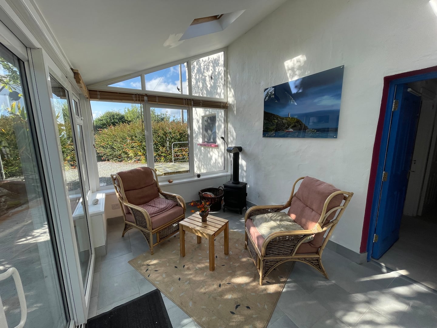 Der kleine Wintergarten ist ihr Frühstücksraum, und sollte es zu kalt sein, wärmen Sie sich einfach am Ofen.
